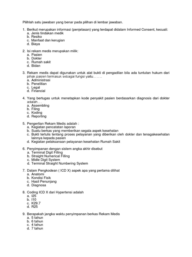 Soal ujian rekam medis dan jawabannya helmi kediris. Contoh soal coding rekam medis ruang belajar siswa kelas 6. 102 contoh soal rekam medis dan jawabannya terupdate. Contoh soal skb rekam medis 2018 adalah merupakan postingan yang akan saya bagikan kali ini. Contoh soal cpns 2018 rekam medis ini tersedia juga dengan kunci jabawan dan pembahasannya. Bpjs koding 16 buku 46 dasar hukum 8 diskusi 5 flashcard 54 info cpns 11 kisi² ukom skb 13 klasifikasi kodefikasi penyakit 2 latihan cpns 32 latihan rekam medis 78 latihan soal 33 managemen kesehatan 10 materi 25 materi seminar 97 mengenal icd 23. Soal post test 2 ikd i. Inilah pembahasan lengkap terkait contoh soal rekam medis dan jawabannya. Bentuk rekam medis ini sangat umum dan dapat ditemukan diseluruh rumah sakit, klinik, maupun praktek dokter. Contoh soal cpns rekam medis. Contoh soal cpns sudah banyak beredar di internet. Sistem informasi rumah sakit 4. Yang telah memberikan materi rekam medis ujian 1 ujian 2 ujian 3 ujian 4 ujian 5 ujian 6 ujian 7 ujian 8 ujian 9 ujian 10 ujian 11 ujian 12 ujian 13 ujian 14 ujian 15 ujian 16 ujian 17 …